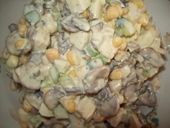 Положить все ингредиенты в салатник, добавить кукурузку и все тщательно вымешать. Посолить, поперчить, заправить майонезом и еще раз вымешать. _________________ Нет никаких ключей от счастья, дверь всегда открыта!